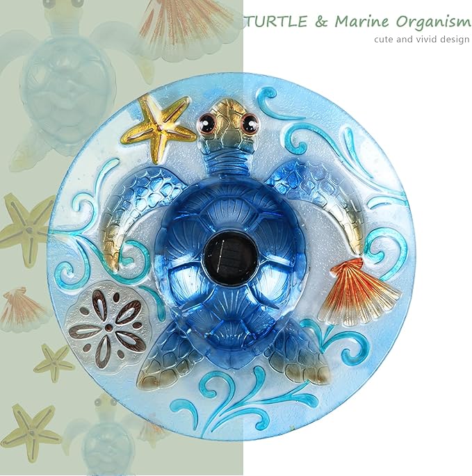 - Sea Turtle Bird Bath: Painted with special hot glass craft, this bird bath has vivid sea turtle pattern and bright blue color which would attract more birds to bathe. Solar power is the icing on the cake, will light up beautiful light at night