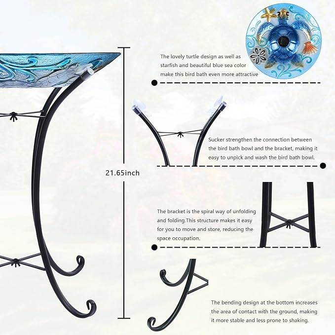 MUMTOP Glass Bird Bath, Bird Baths for Outdoors, Solar Birdfeeder with Metal Stand for Garden, Yard, Lawn Decor sea Turtle Pattern(Blue, 21.5"X18")