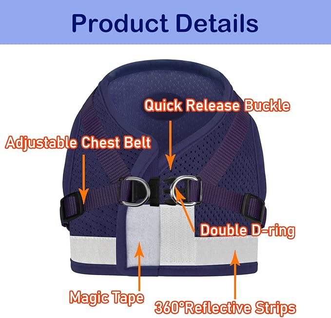 - Step in Small Dog Harness: Soft Mesh Harness also very light weight. There are Magic Tape and Plastic Clip Closures, and two D-rings for leash attachment for added security. Vest-style Design can evenly distribute leash pressure across the chest and shoulder to prevent choking or neck strain. You will love this cat vest harness. This vest is very comfortable for your pet and easy to put on and take off.