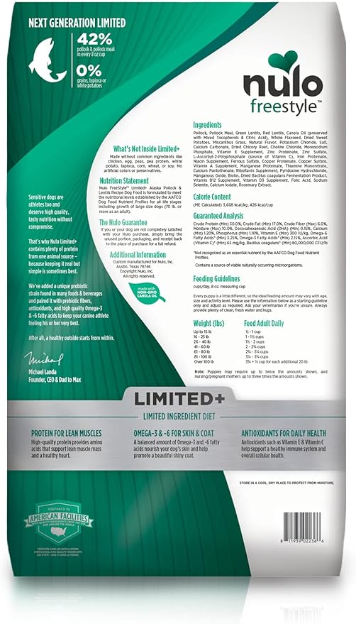 - Limited Ingredient Dog Food – Nulo FreeStyle Limited+ Alaska Pollock & Lentils Recipe is a grain-free, single-protein dog food designed for dogs with food sensitivities. Crafted with real pollock and no chicken, eggs, or artificial additives.