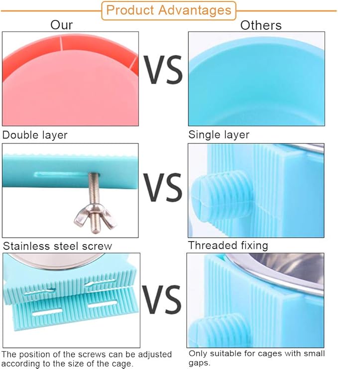 - Hanging Cage Design: The corrugated design locks the cage bars securely and is not easy to fall off. Removable stainless steel inner bowl with smooth surface, easy to clean.