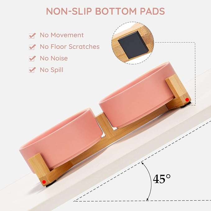 - Double Bowl Design:One dog bowl for food and one for water, Each ceramic cat bowl has a Unique wooden stand, raising the dishes closer to your pet for more comfortable eating
