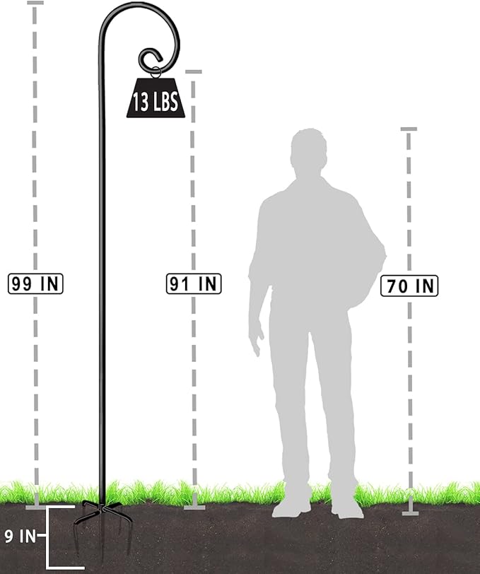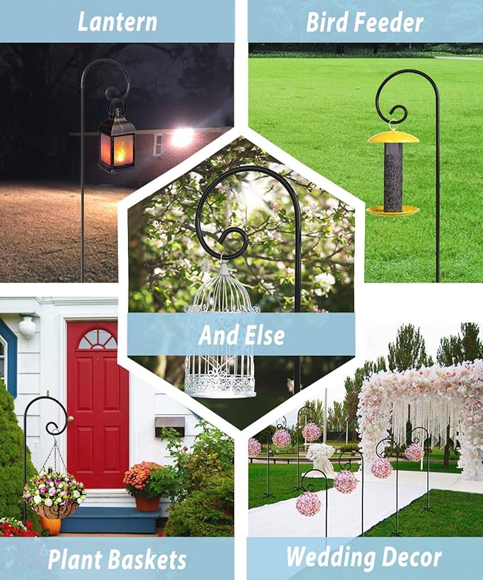 - Multi-Purpose - The outside birdfeeder poles are ideal for hanging bird feeders, flower plants, flower balls, lanterns, flower pots, solar lights, lanterns, flower jars, small bells, candle holders, garden lights, mason jars, string lights, wind chimes, ornaments, birdbaths, shooting targets, plant baskets, holiday ornaments, wedding outdoor decorations, coconut coco-fiber, moss baskets, hummingbird feeders and other accessories