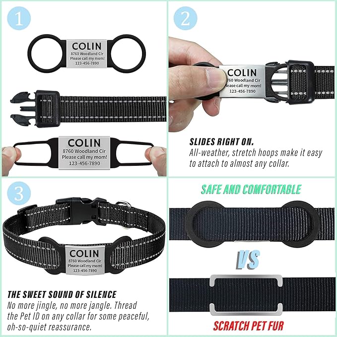 - 🐶 Silent, Durable, And Lightweight Dog Tags: Made from rustproof stainless steel & silicone, our pet tags for dogs and cats will stand the test of time. The easy, slide-on design makes our pet ID tag silent and ideal for puppies and kittens.