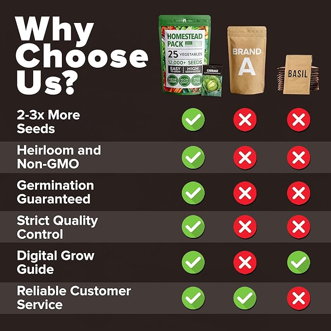 - 25 HEIRLOOM VARIETIES AND 12,000+ SEEDS FOR YEAR-ROUND HARVESTS. This comprehensive seed collection includes 25 traditional varieties and 12,000+ non-GMO seedsβoffering a continuous supply of robust, hardy vegetables that thrive in both hot and cold climates. Each variety was chosen for its flavor, productivity, resilience, resistance, growth cycle, and nutritional profile.