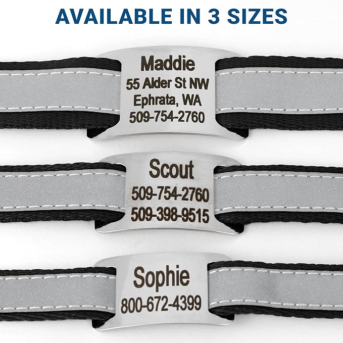 GoTags Reflective Personalized Dog Collar with Nameplate, Adjustable Dog Collar with Custom Engraved Steel Slide On Pet ID Tag, Silent, No Noise Dog Tag for Large Medium or Small (Black, Small)