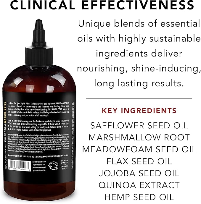 - COATCARE: Each PRIDE+GROOM formula contains unique blend of all-natural essential oils, signature scents and sustainable ingredients for dog’s specific coat + skin types that provide healing, hydrating, cleansing, nourishing and beautifying benefits.