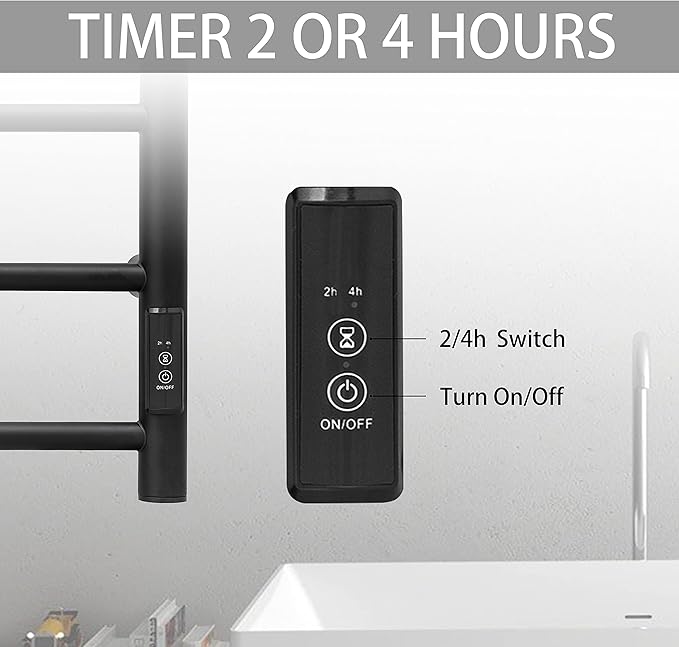 - Timer & LED Indicators: The towel warmer has a built-in timer of 2h or 4h with a visual LED indicator. Press the 2 or 4 hour buttons will dry your towels, and then it will automatically shut off itself when time is up.