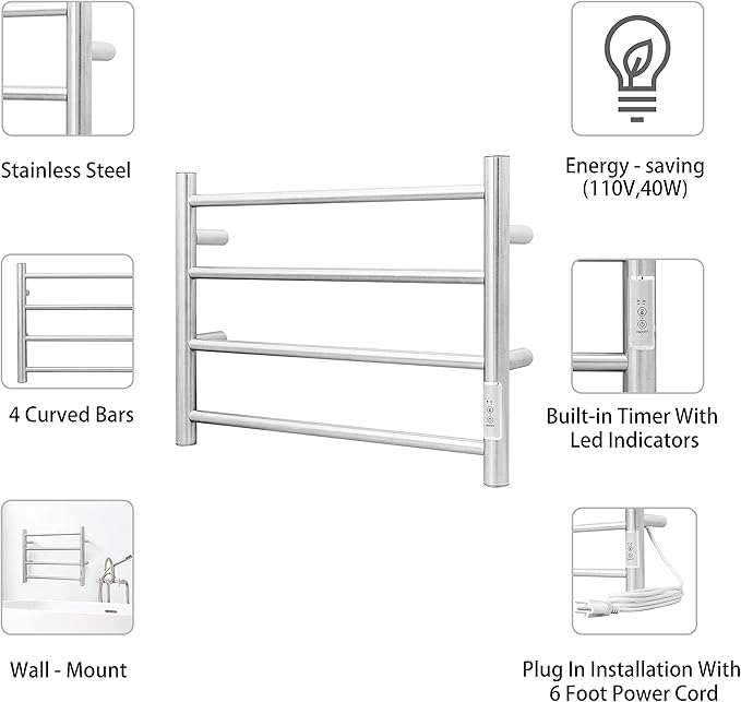 KEG Towel Warmer Wall Mounted with Built-in Timer 4 Bars Electric Stainless Steel Heated Towel Racks for Bathroom, Hot Plug-in Bath Towel Heater Brushed Nickel