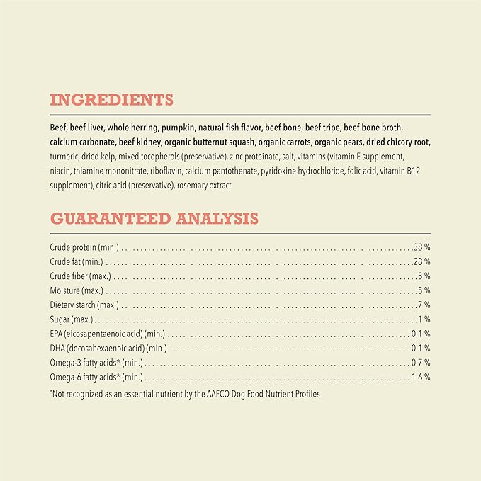 - Made with farm-raised beef, organs and bone, this grain free* freeze dried dog food offers a balanced recipe with 90 percent** quality animal ingredients