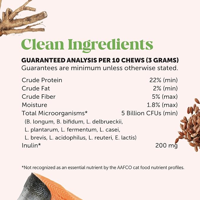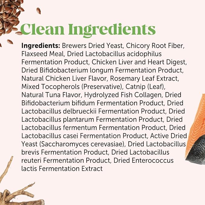 - A blend of natural ingredients like chicory root (prebiotic source), catnip, chicken liver, fish collagen and probiotics promotes healthy digestion and immune support to help your cat live their happiest and highest quality of life possible!