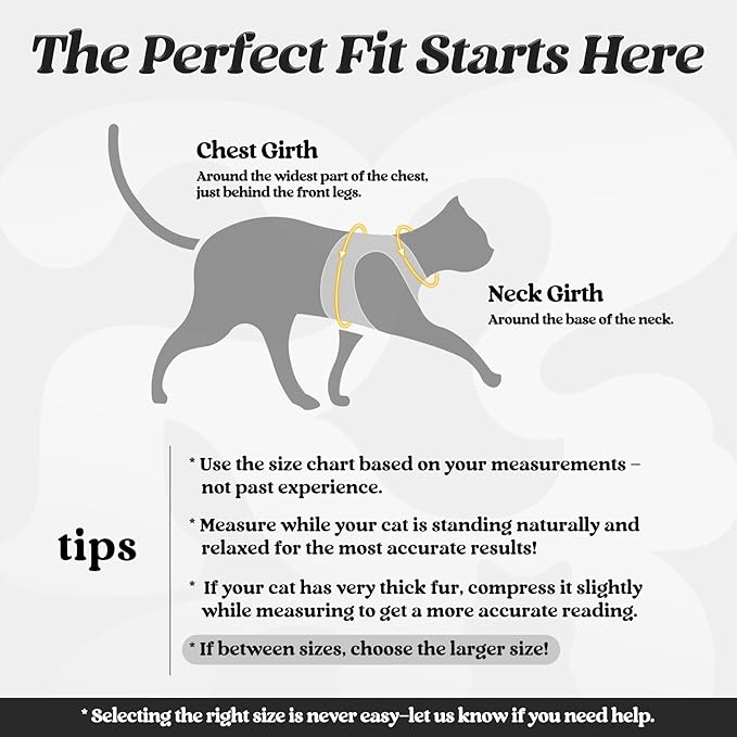 - Perfect Fit: Neck Girth: 9.0" - 10.0" , Chest Girth: 12.4" - 13.8". For a better fit, measure accurately and check our size chart. We recommend choosing a larger size for growing cats or if your cat is between sizes. Set includes 1 cat harness and 1 cat leash (59 inch)