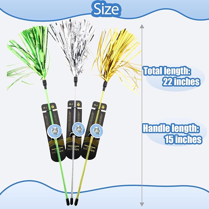 - đșăInteractive Cat Toys:ăïŒPack of 3 (Gold + Green + Silver). Colorful tassels and durable wand. This cat wand help your cats keep active and do more exercise, increasing kittenâs interest and stimulate catâs sense, and make teasing a cat is no longer a manual job for you. This interactive toys engage your cats with you and it builds trust and companionship.