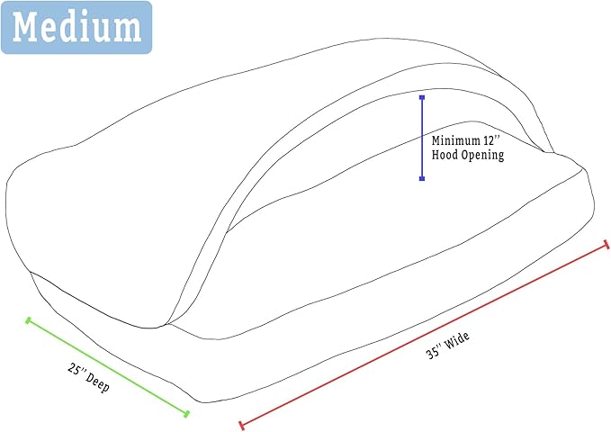 - SIZING: This Medium Rectangle Cozy Cave measures 25” x 35” and has an approximate hood opening height of at least 12”. A thin removable plastic tube keeps the hood open for easy entry or exit and can be removed through the small hole at the corner of the hood for a looser, blanket-like structure. This size Medium provides space for mid-sized breeds while creating a snug, enveloping feel.