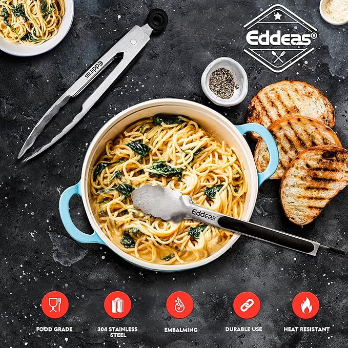- MULTIPLE APPLICATION - Perfect for everyday kitchen tasks or outdoor use, whether you use them as salad tongs, grill tongs, need reliable metal tongs to grab food from boiling water, or as a grill Turner or salad server, EDDEAS tongs will meet your needs for safety and stability.Size:9in