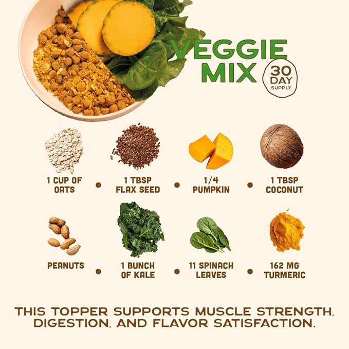 - HELP YOUR DOG EAT THEIR VEGGIES: Dogs need their veggies too, which is why we created this delicious vegetarian dog food topper. With real ingredients like kale, spinach, oats, nuts & seeds, your picky pup will have a balanced diet with all the nutrients they need, plus a tasty treat to top their meal!