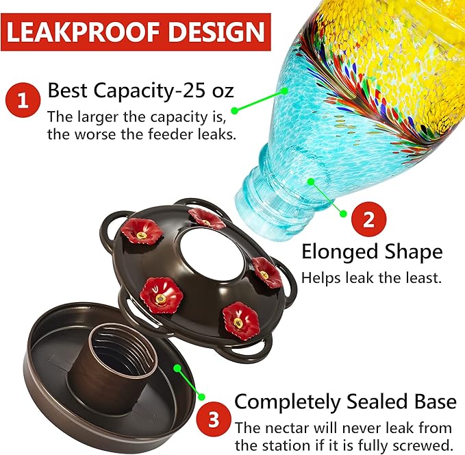 - LEAK PROOF: No more worries about leaks! This stylish glass hummingbird feeder features a 25 fluid ounce capacity, a slender shape and a completely enclosed station that prevent leaking, drips and spills
