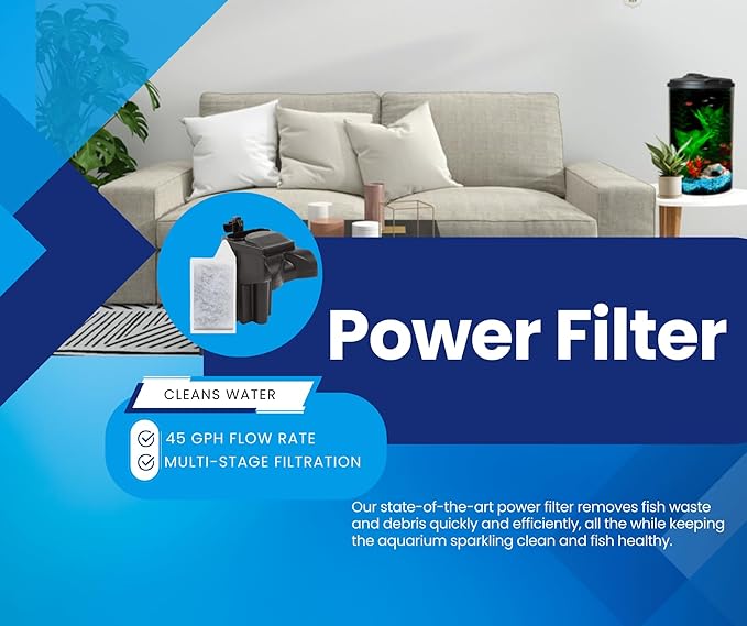 - COMPLETE FILTRATION: Powerful internal power filter cleans and purifies aquarium water at a flow rate of 45 gallon per hour, effectively removing fish waste and debris; uses Koller Products S replacement filter cartridges (AQ10FC-60), available on Amazon.