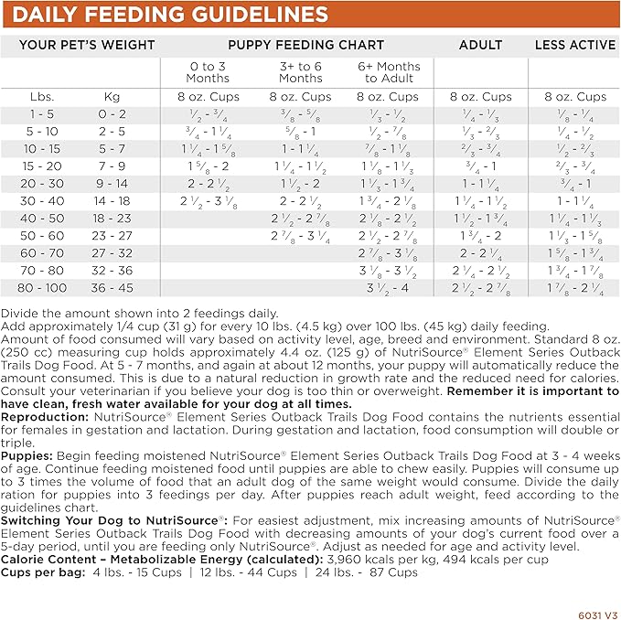 - CONTAINS: (1) 4LB Bag of NutriSource Element Series Outback Trails Dry Dog Food