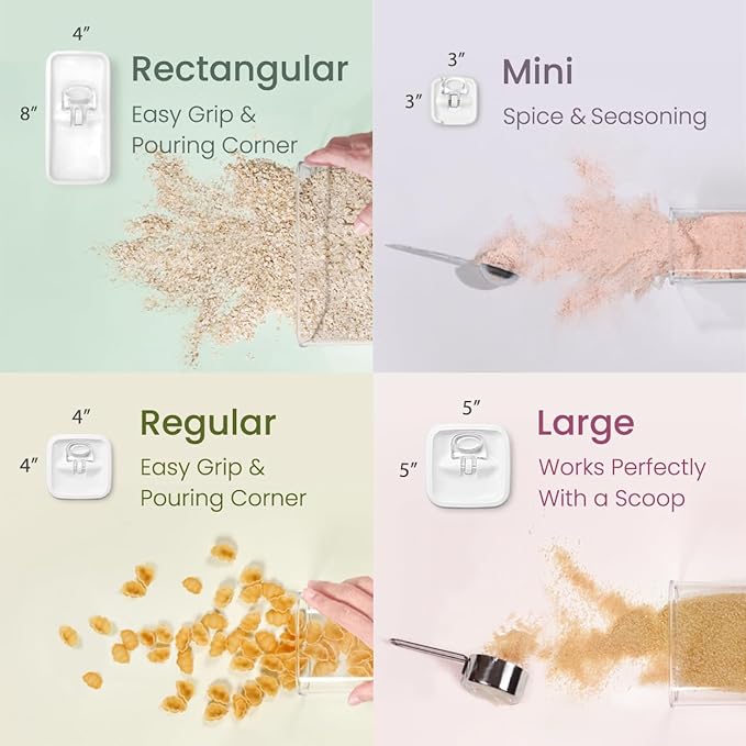 - 10 PIECES SQUARE + RECTANGULAR CONTAINER - GIFT SET: Set includes 4 inch width Regular + Rectangular sized containers, both shapes can be stacked firmly on top of each other. 1 x Rectangular-L (2.8qt), 1 x Regular-Tall (2.0qt), 2 x Regular-L (1.3qt), 2 x Regular-M (0.8qt), 4 x Regular-S(0.5qt), each size is perfectly calibrated to store common household staples including spice, seasoning, rice, cereal, granola, flour, sugar, pasta, coffee, fruits, snacks.