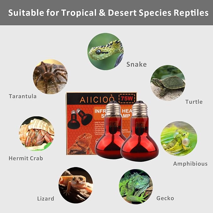 - Efficient Heat Emission - AIICIOO infrared heat lamp emits powerful infrared heat waves that raise the overall air temperature inside your reptile terrarium, with reptile heat lamp powerful infrared heat radiation, this red heat lamp bulb can raise the temperature inside reptile terrarium to create a warm and comfortable environment for them to rest and thrive in.