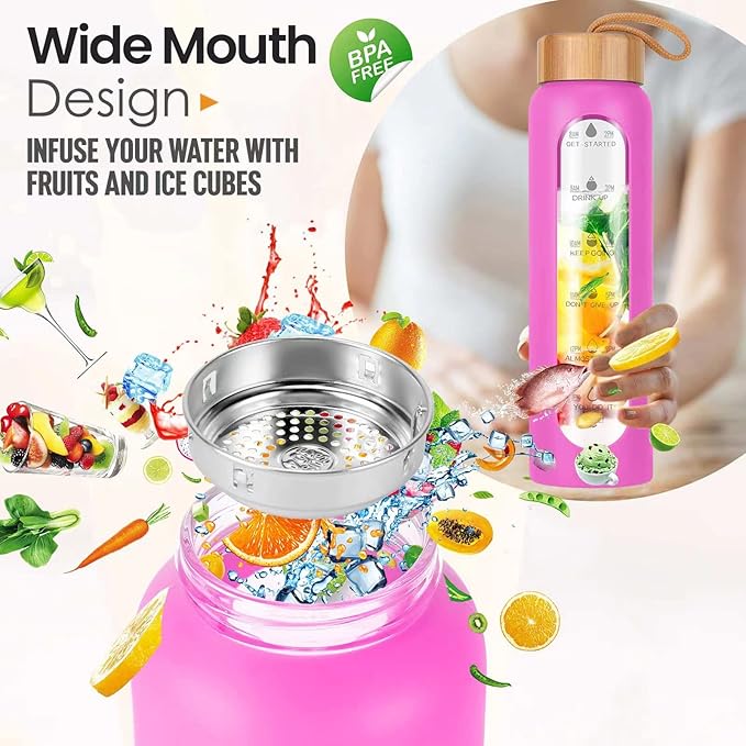Aqulea Glass Water Bottles 32 Oz with Silicone Sleeve - BPA Free Reusable Wide Mouth Glass Motivational Water Bottles with Fruit Infuser – Leak Proof Borosilicate Water Bottle with Time Marker (Rose)