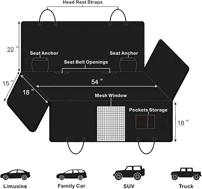 - *SIZE & MATERIAL - Maximum open size (54"W x58"L) dog car seat cover fits to different vehicles like STANDARD cars, trucks, SUVs, including baby car seats. Heavy-duty material with 600D oxford & NEW PU material is tough as nails, scratch resistant and 100% waterproof.