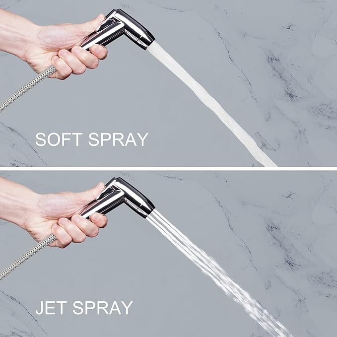 - Water Pressure Control: The faucet sprayer set has 2 spray modes: jet spray and soft mode. Gentle soft mode for feminine bottom cleaning, baby bath, or pet bath. Jet spray for rinsing floor, carpets, or baby cloth diapers
