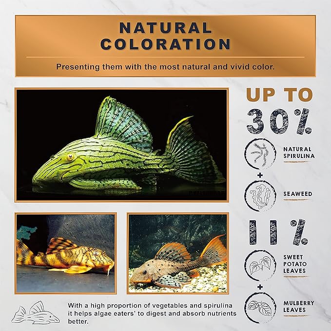 - ALL NATURAL FLAVOR Formulated with high content of natural spirulina, seaweed, sweet potato leaves, mulberry leaves, wild sword prawns, garlic and a variety of carefully selected natural ingredients that delivers superb palatability and well balance nutrients for algae eaters. Even the pickiest ones can't resist it!
