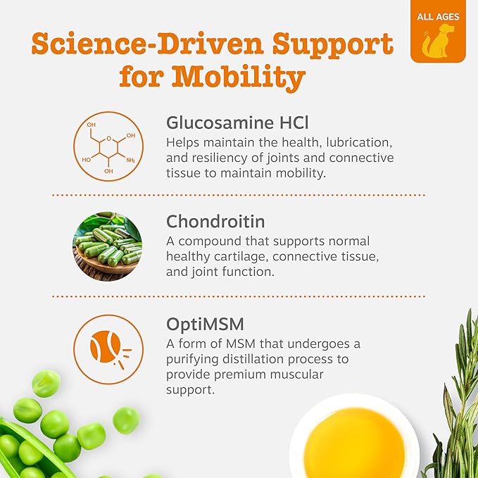- GLUCOSAMINE HYDROCHLORIDE FLEXIBILITY: This dog glucosamine and chondroitin supplement helps maintain joint health, lubrication, and resilience for an active lifestyle