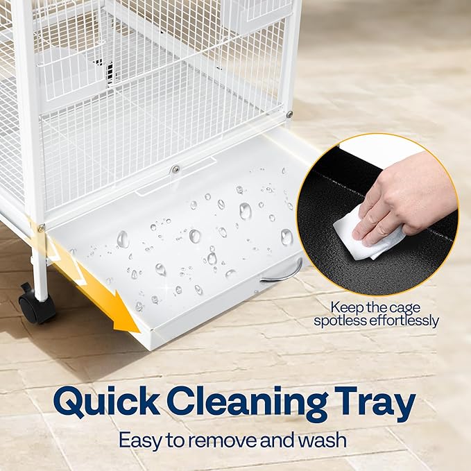 - EASY CLEANING - To clean the bottom of this birdcage, all you need to do is to slide out the bottom tray and wash it off; Additionally, all shelving can be easily removed for easy cleaning, to keep a clean and tidy environment as well as keep your pets safe