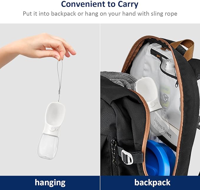- [Convenient to Carry]: Enough capacity and compact water bottle design is great for your pet dog or cat when outdoor walking, running, hiking, traveling or playing, etc. You can put it into backpack or hang on your hand with sling rope, very easy to carry to anywhere you want.