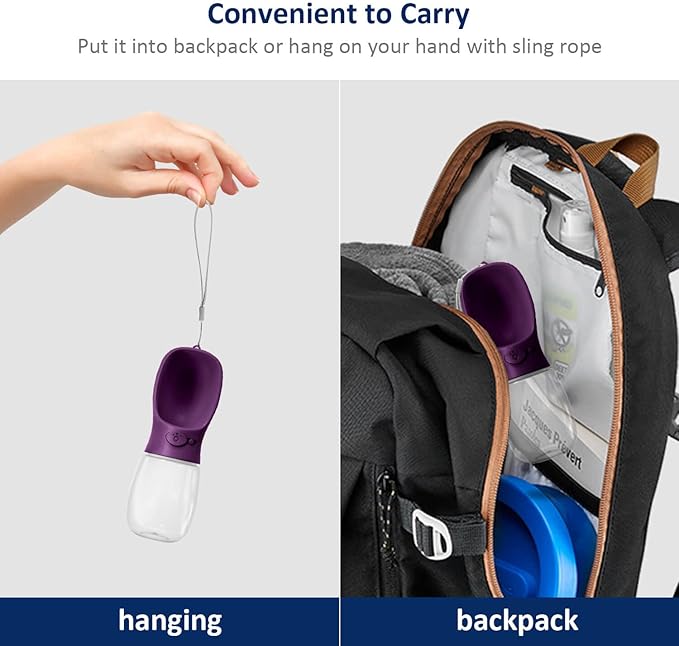 - [Convenient to Carry]: Enough capacity and compact water bottle design is great for your pet dog or cat when outdoor walking, running, hiking, traveling or playing, etc. You can put it into backpack or hang on your hand with sling rope, very easy to carry to anywhere you want.