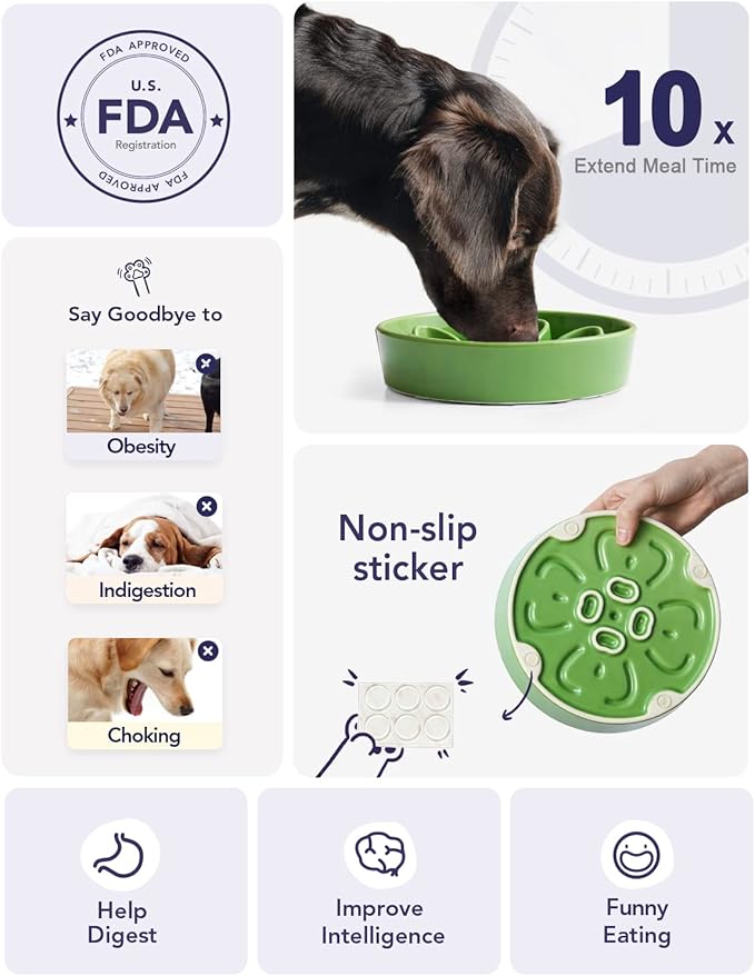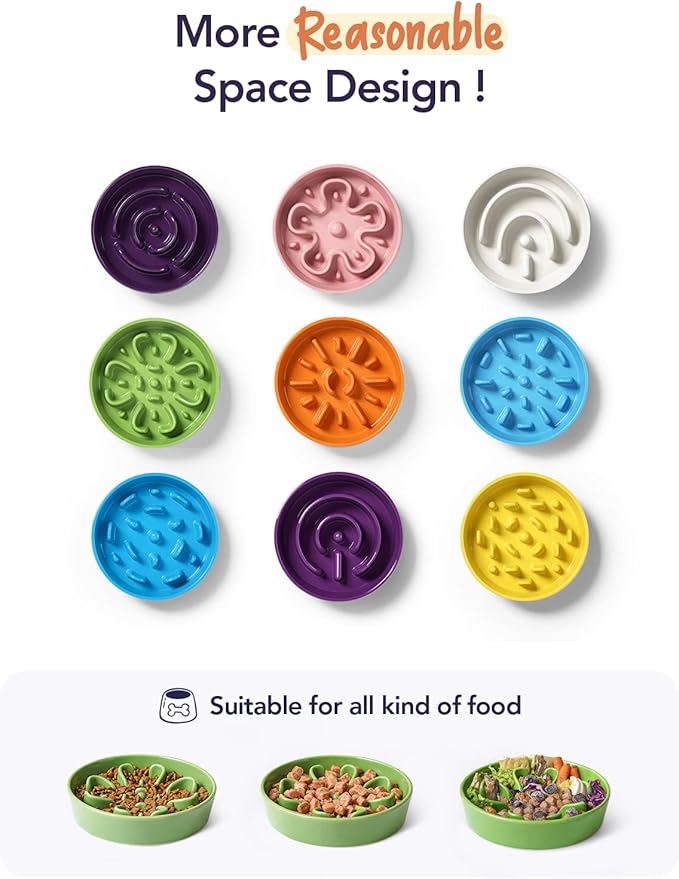 - Slow Down Eating, Bring Dog A Healthy Diet: Fast-eating dogs experience bloat, regurgitation, and obesity easily. Our slow feeder dog bowl design with the ridges and maze pattern helps your dog to eat slower than 10 times. Your dog could change his overeating behavior through a challenge and fun mealtime