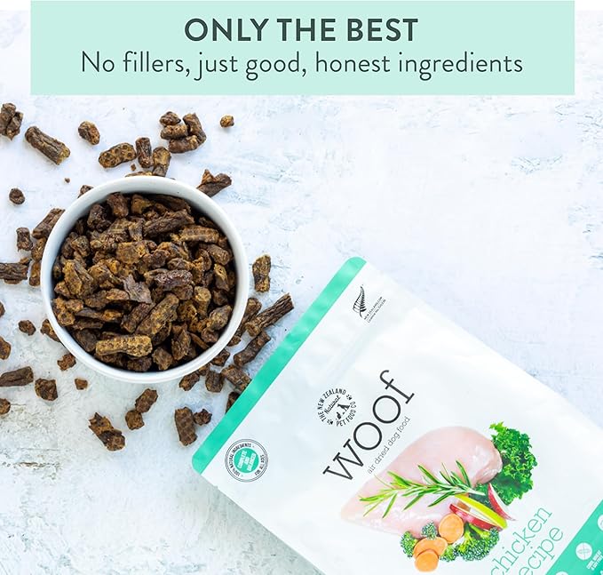 The New Zealand Natural Pet Food Co WOOF Air Dried Dog Bites - Chicken Recipe Dog Food High Protein Toppers for Dry Dog Food, Healthy Dog Food,26.5oz