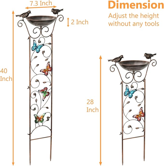 - 【Elegant Design 3 in1】It features 2 decorative metal birds and a bowl as the bird bath at the top can attract birds here to take a bath. 4 bright-colored butterflies on the trellis create a conducive environment for climbing flowers. It also can be left unadorned to lend sculptural interest to garden, flower bed or border.