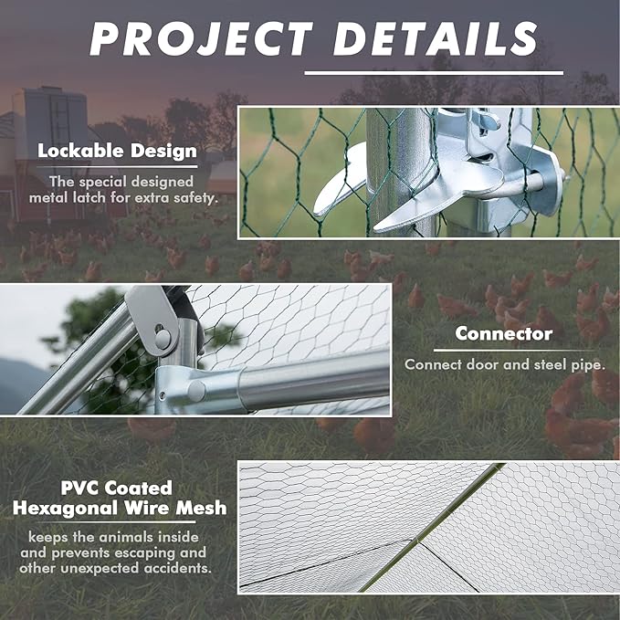 - Prefect chicken coops for backyard and Farm: Lockable steel door with a latch and steel wire ties for extra safety. the small gaps between meshes add safety to your chicken that prevent them from some predators,It also prevents chicks from escaping