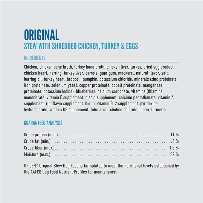 - Twelve (12) 12.8 oz cans of ORIJEN Original Stew Recipe with Chicken, Turkey & Eggs Wet Dog Food