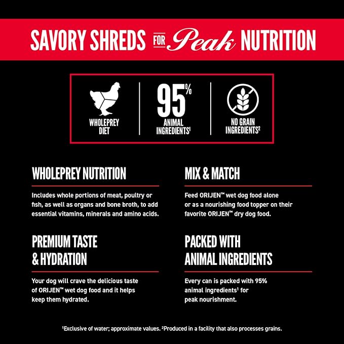 - ORIJEN wet dog food is tailored to help your dog thrive with a high moisture content to keep your canine hydrated