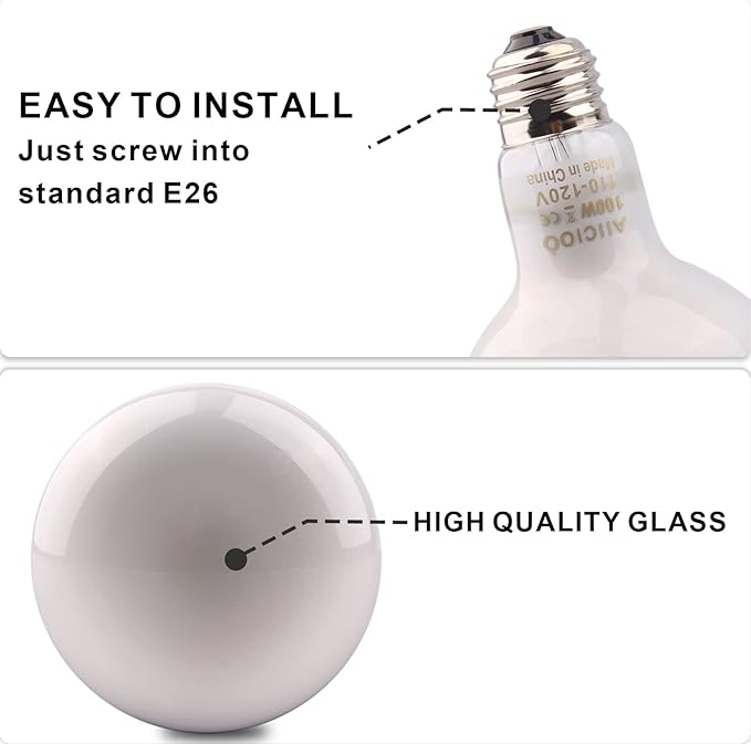 - High-Quality Materials - Reptile heat bulb made with durable glass and metal, our heat lamp bulbs offer reliable heating for your pet.Remember to wait 30 minutes before touching the hot white lamp reptile heat bulb to avoid burns.