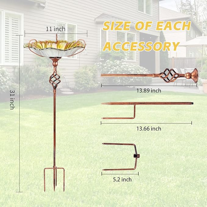 - New Upgrade - Bird bath is made of handmade glass, the birdbath bowl has a beautiful Yellow sunflower pattern, and metal stake base is upgraded to four-pronged bottom, which greatly increases the stability of glass bird bath