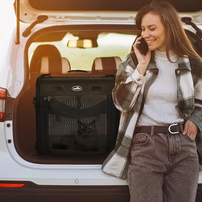 - 🐶【VENTILATED & WASHABLE】: ①Large Dog Travel Carrier has 4 sides breathable & anti-scratch mesh window; ② Washable Mat with a hard panel to stand lying inside;③ More stable Dog Crates add reinforced plastic sheet on the top and use stronger steel material on the frame, which can keep the shape from collapsing; ④ 2 pcs of the adjustable hammock for cats.