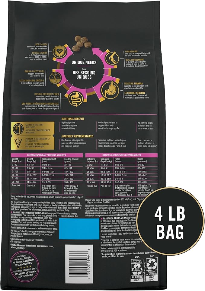 - Purina Pro Plan senior dry dog food containing salmon as the number one ingredient, plus easily digestible oat meal and rice is gentle on the stomach and maintains stool quality