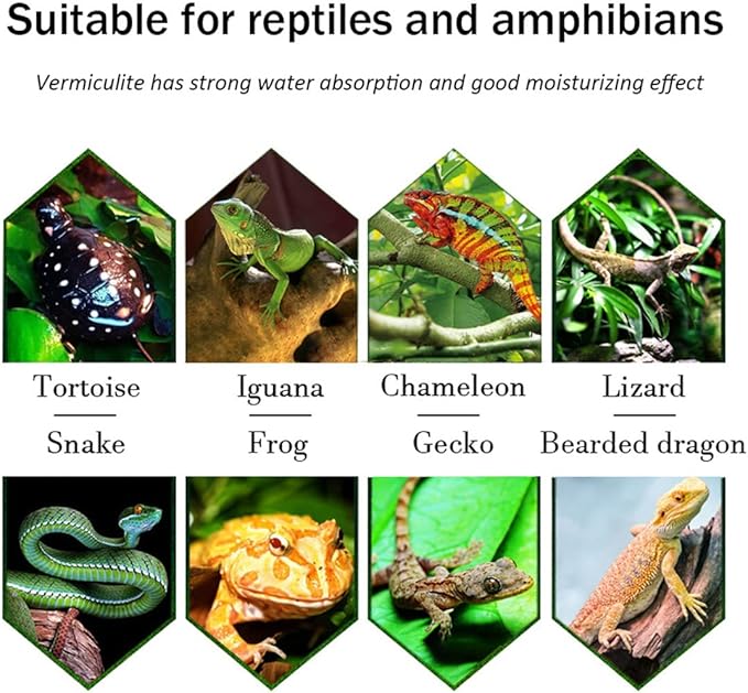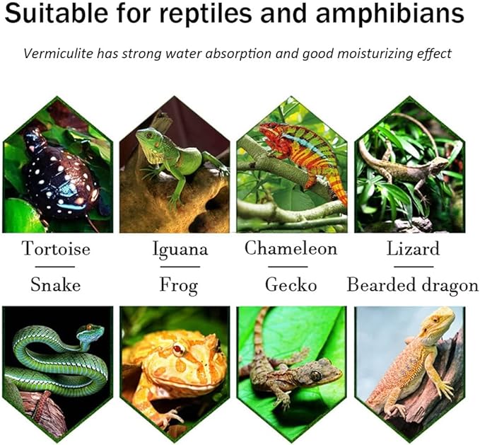 - NATURAL MATERIAL:This reptile vermiculite bedding is made of natural vermiculite, which is a natural mineral,it’s non-toxic and odorless, and very safe for reptiles.It can be placed in the terrarium as bedding substrate or used to hatch turtle eggs.