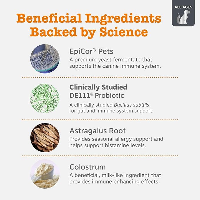 - IMMUNE SYSTEM SUPPORT: These allergy chews for dogs and itchy skin feature EpiCor Pets, a whole food yeast fermentate, to help strengthen your dog's immune system for healthy responses