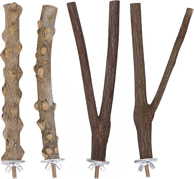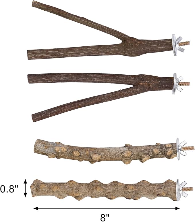 - 【Size】: Y-shaped bird perch*2, straight-shaped bird perch *2, approx 7.9” long and 0.8” in diameter. Each wood perch is able to accomodate 3-4 birds at the same time, perfect for budgies, conure, parakeets, cockatiels, lovebirds or other small birds.