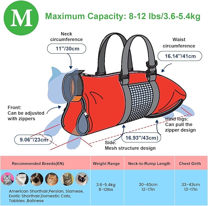 - Cat Grooming Bag with two rear zippers allow access to rear paws.