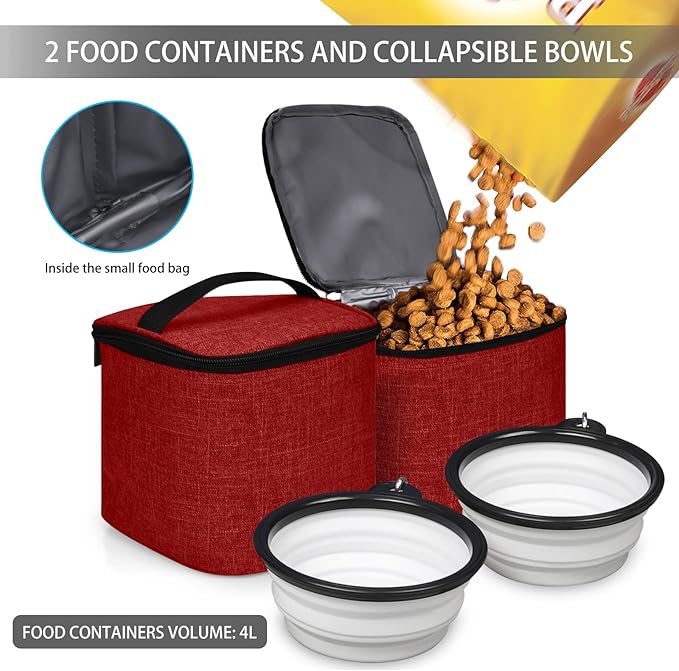 BAGLHER Pet Travel Bag, Double-Layer Pet Supplies Backpack (for All Pet Travel Supplies), Pet Travel Backpack with 2 Silicone Collapsible Bowls and 2 Food Baskets Red