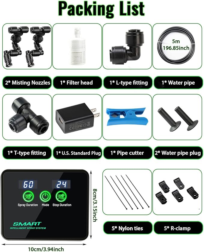 - Included Components : Core Components: 1* SMART Misting System Mainframe 1* U.S. Standard Plug 5V2A 2* 360°Adjustable Misting Nozzles 1* Water pipe 5m, 1/4'' diameter 1* T-type water pipe fitting 1* L-type water pipe fitting 1* Filter head 2* Water pipe plug Core Components: 1* SMART Misting System Mainframe 1* U.S. Standard Plug 5V2A 2* 360°Adjustable Misting Nozzles 1* Water pipe 5m… See more