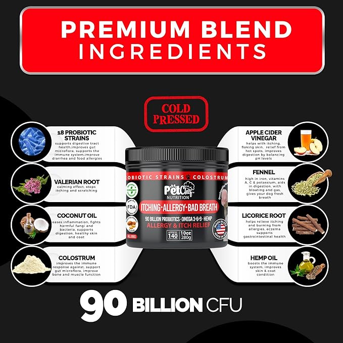 - Keep your pup happy and itch-free with Pet Chef Dog Itching Stopper and Allergy Defender: Tame relentless itching and soothe irritated skin with this natural solution, specially crafted as a dog allergy relief chew. Infused with Omega 3 and Salmon Oil, it effectively moisturizes and nourishes your dog's coat, providing immediate allergy and itch relief for dogs. Witness a joyful transformation in your pet's demeanor as these allergen-free chews enhance their well being and comfort.